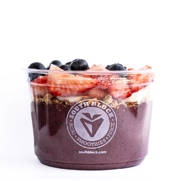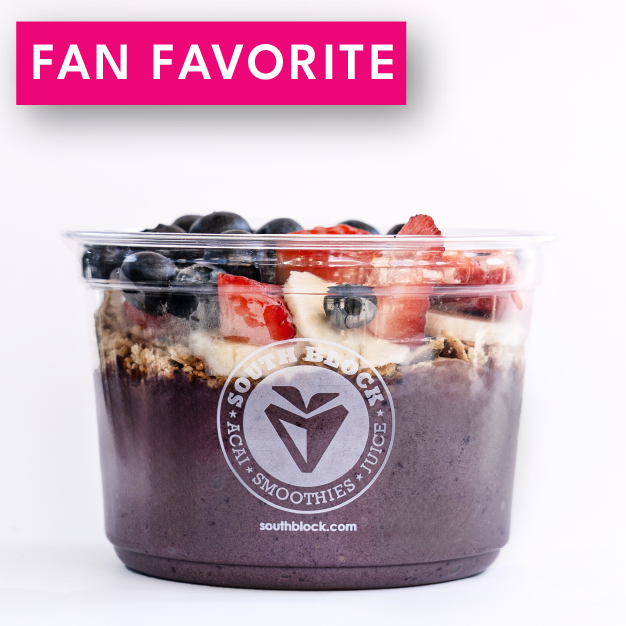 BLEND: organic acai, bananas, blueberries, and unsweetened almond milk TOPPED: organic granola, strawberry, blueberry, banana, hemp hearts