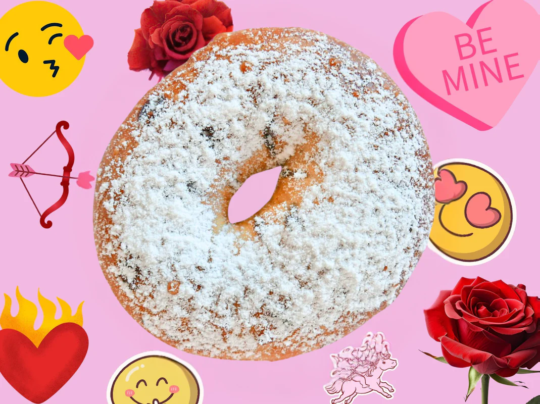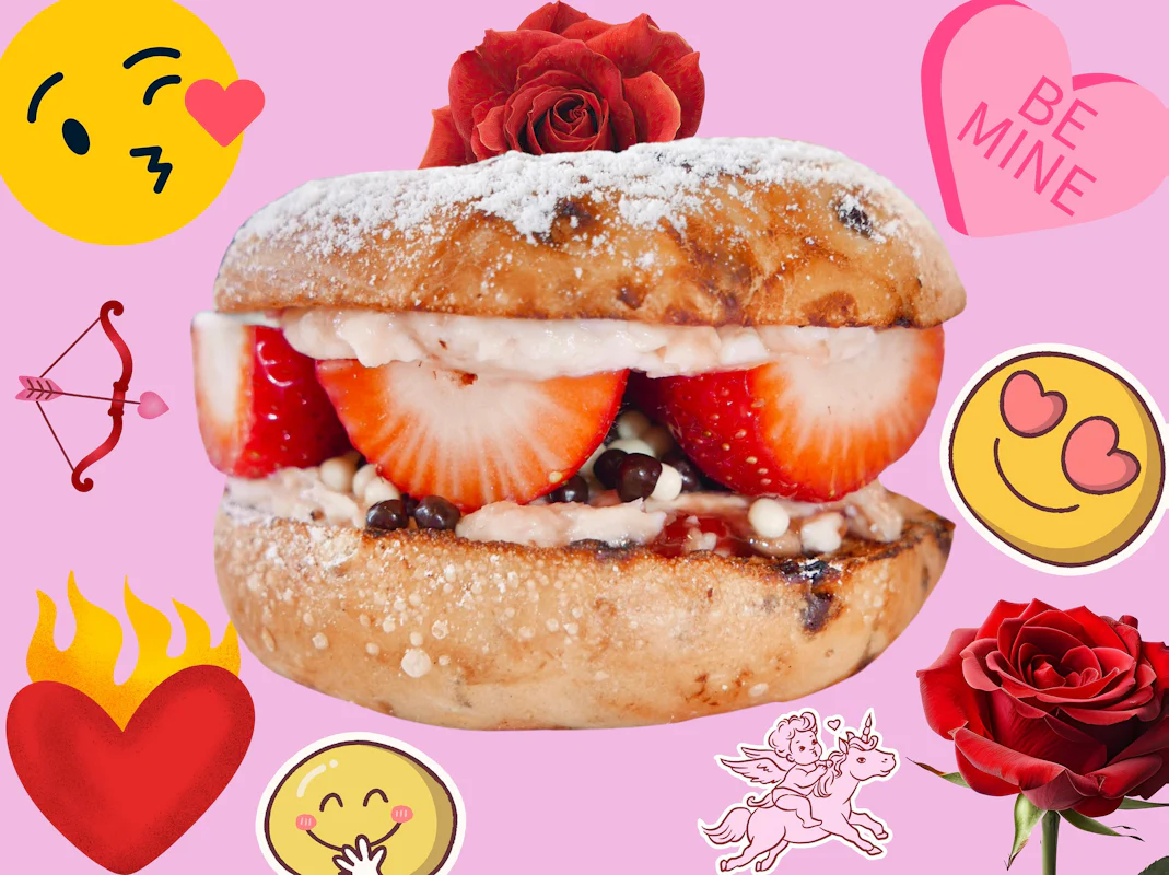 Chocolate chip bagel, strawberry swirl cream cheese, fresh strawberries, and crispy black & white pearls. Dusted with snow sugar.