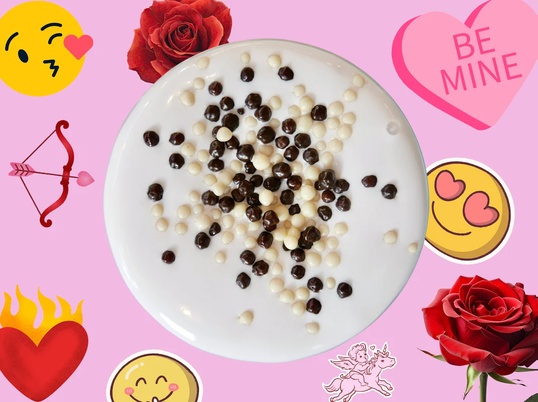 White chocolate iced latte topped with cherry cold foam and crispy black & white pearls.